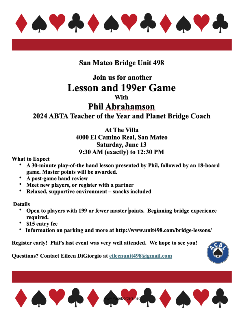 Phil Abrahamson and a 199er game on June 13. A 30-minute lesson starts at 9:30 with a 199er game to follow at 10:15.