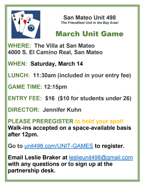 Entry fee is $16 ($10 for students under 26), including lunch. If you do not yet have an ACBL number, please sign up in advance for a